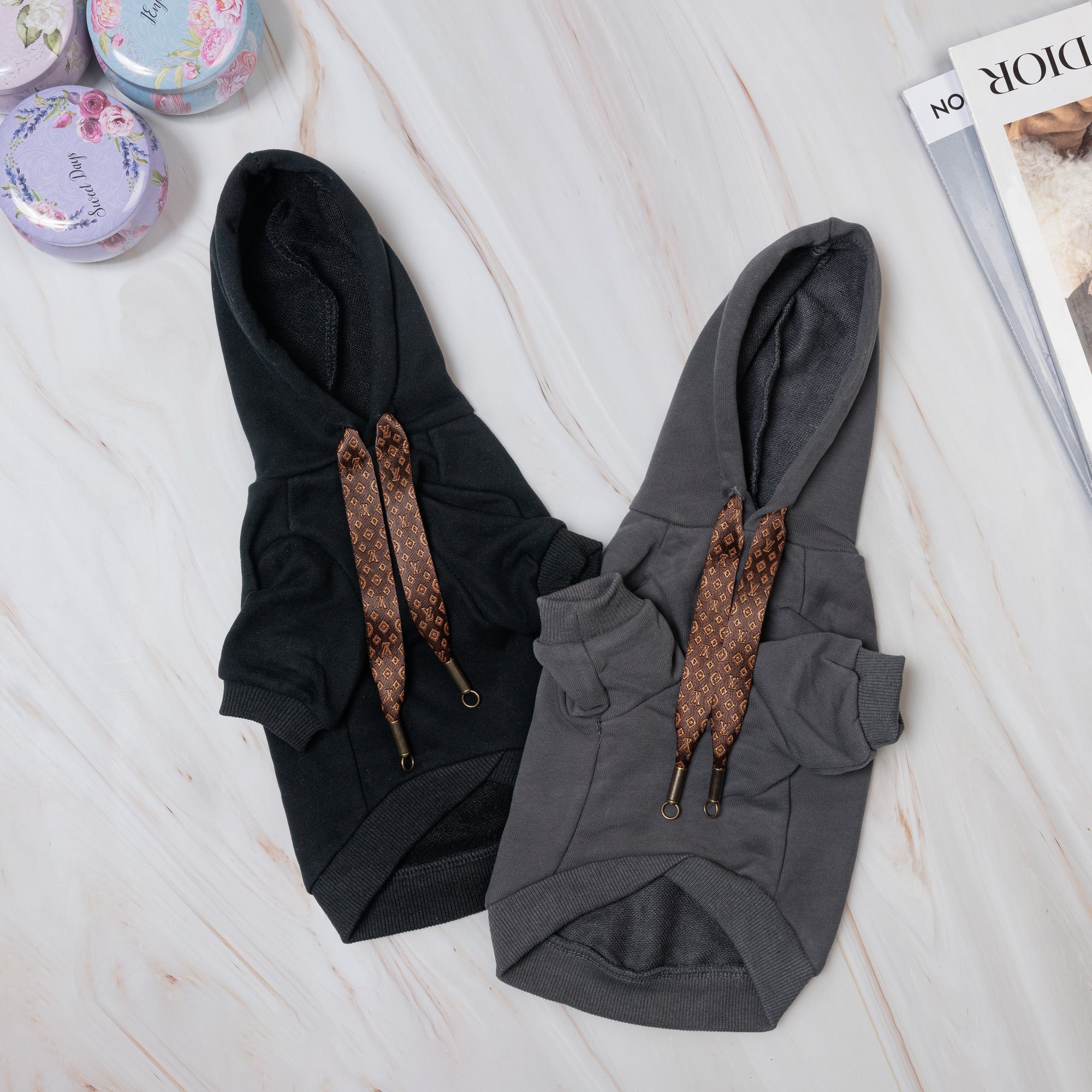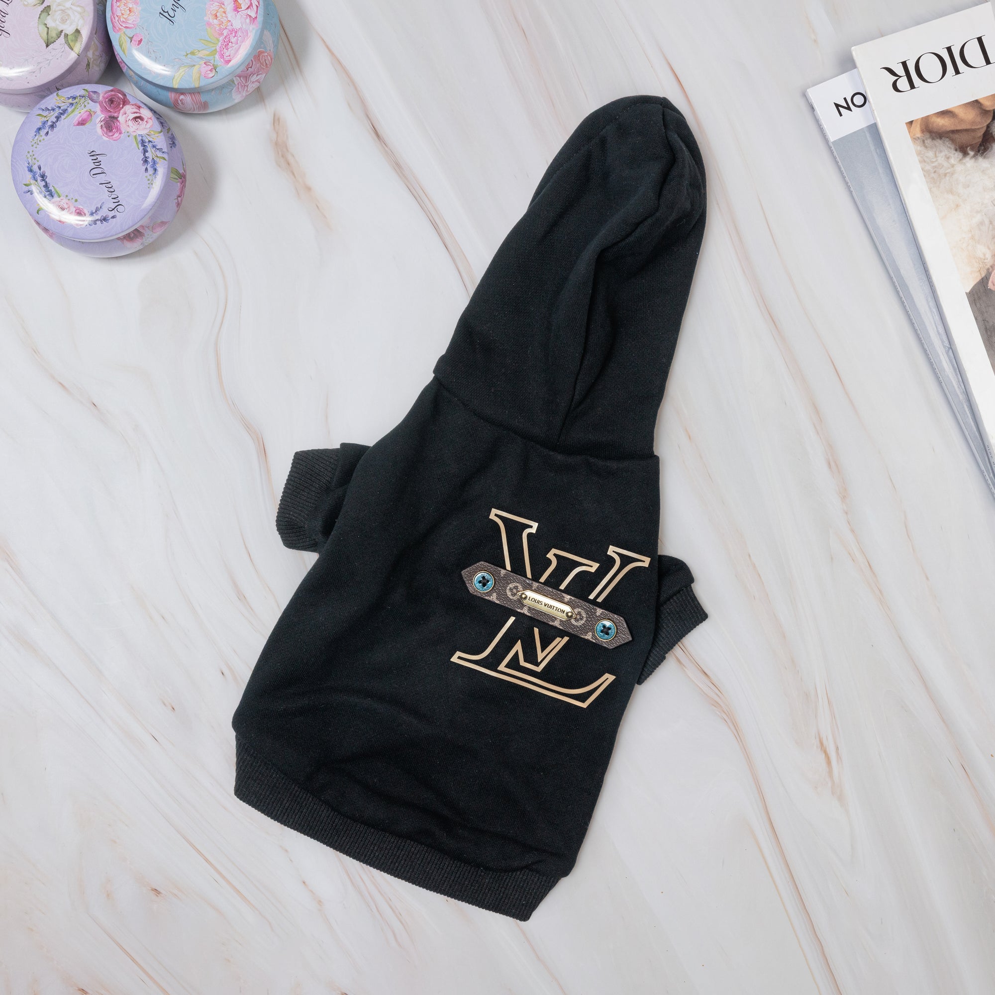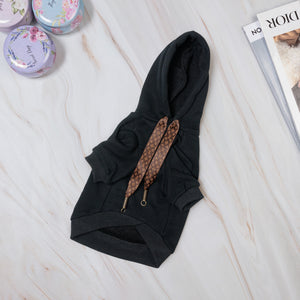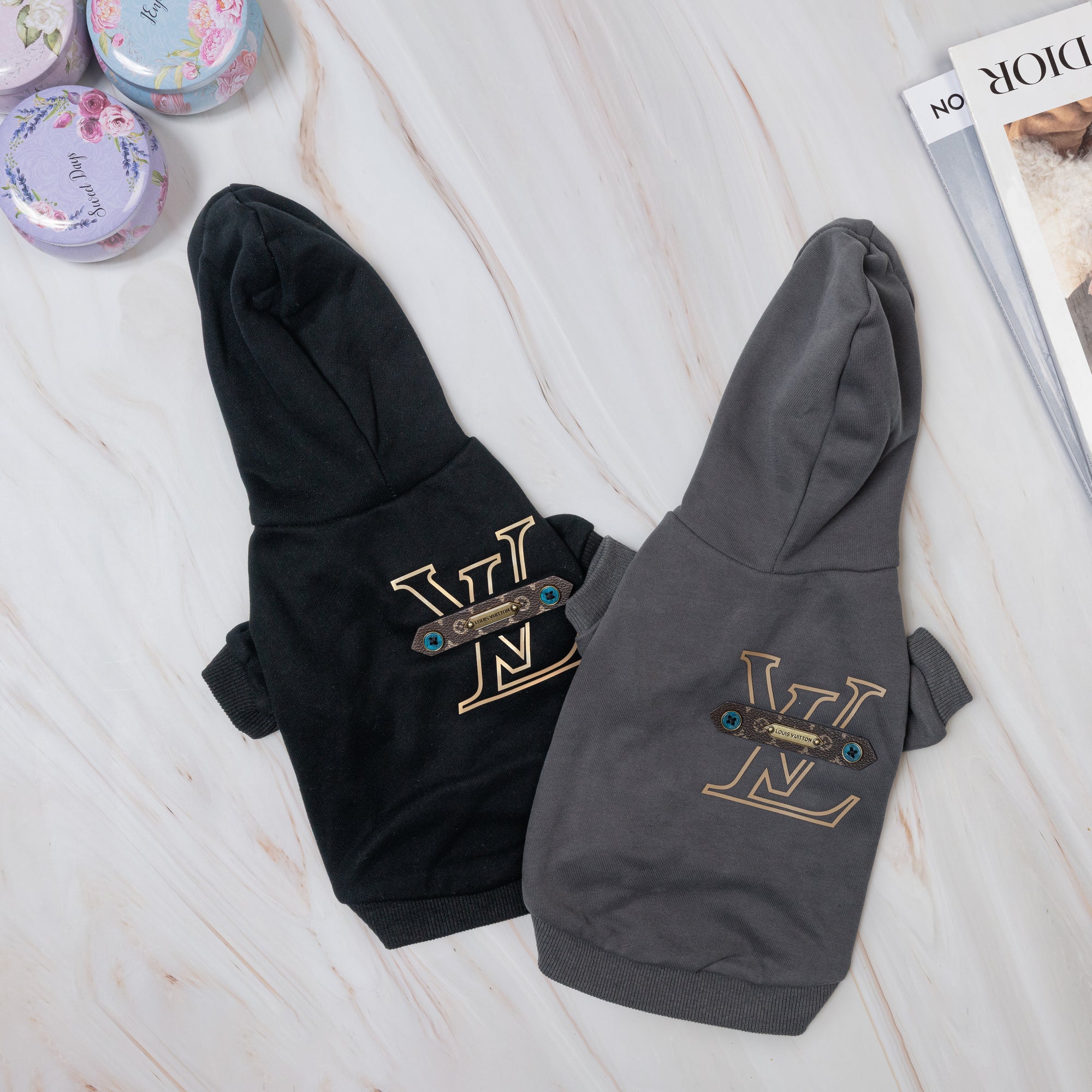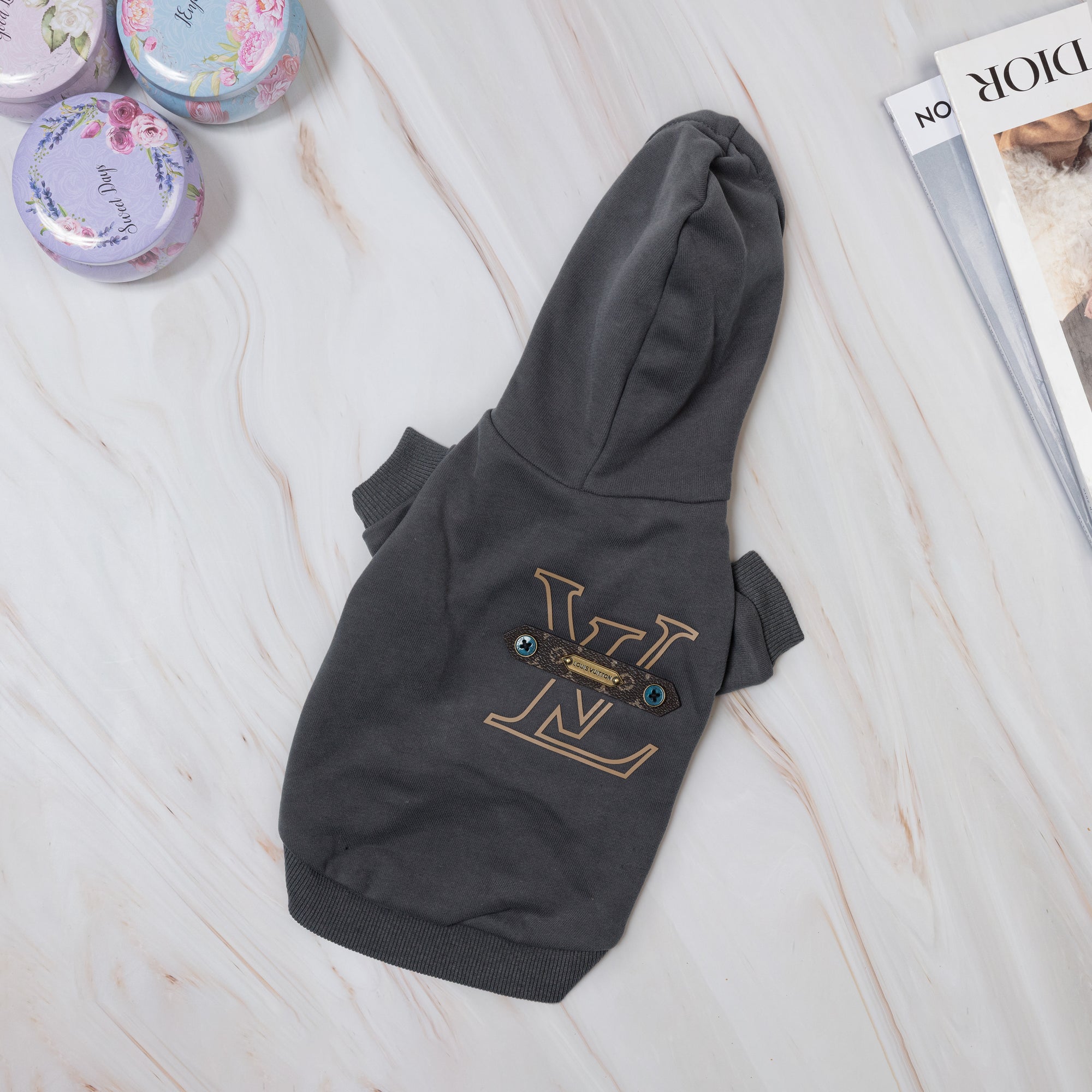 A bold essential with couture influence. The Monogram Signature Hoodie features a clean silhouette elevated by a statement monogram-style detail on the back. Soft, comfortable, and effortlessly stylish, it’s an everyday hoodie designed for dogs who keep their look sharp and modern.
